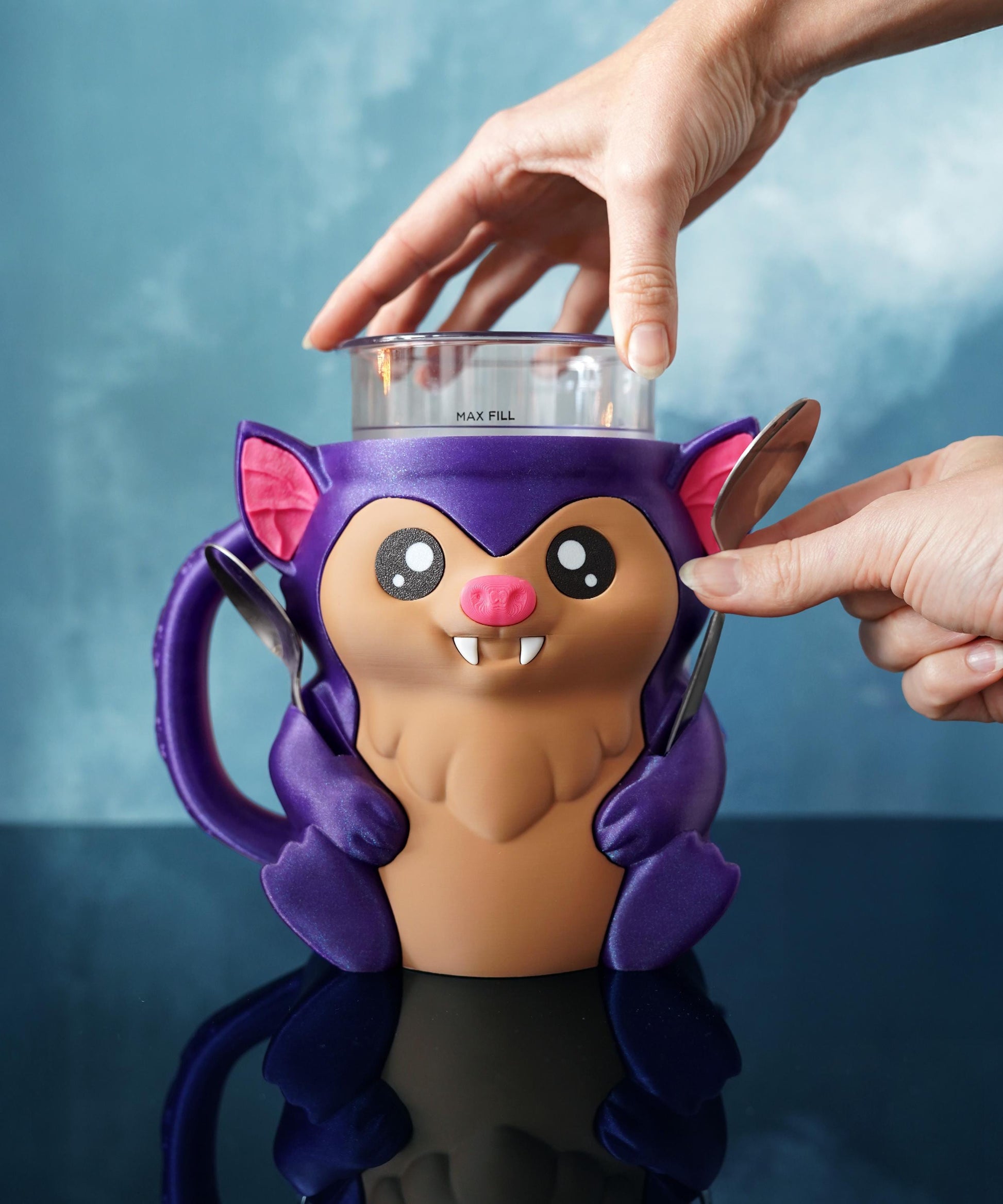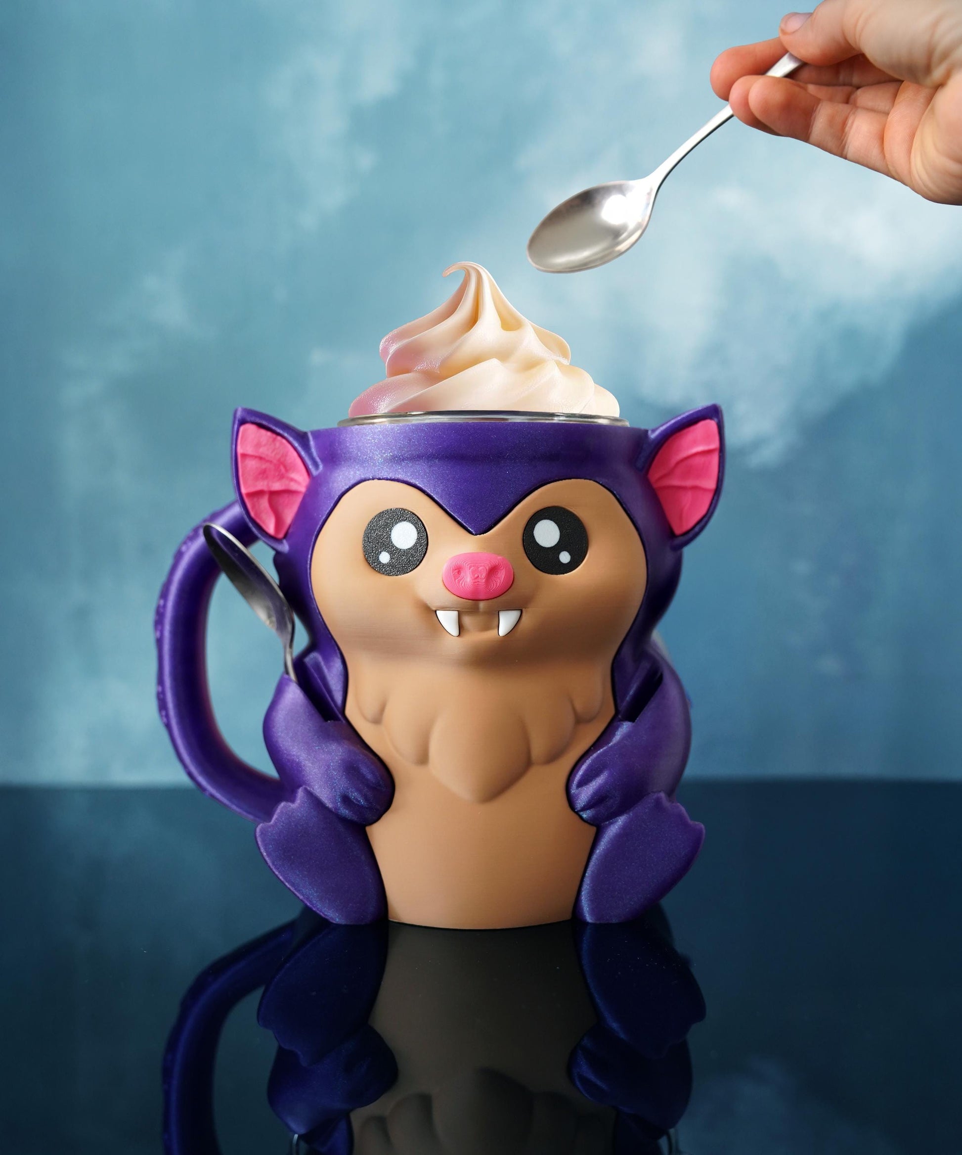 Con alas anchas, orejas puntiagudas y una sonrisa fantástica, Bramble envuelve tu pinta en un encanto gótico mientras mantiene tus manos calientes y tu helado perfectamente frío.