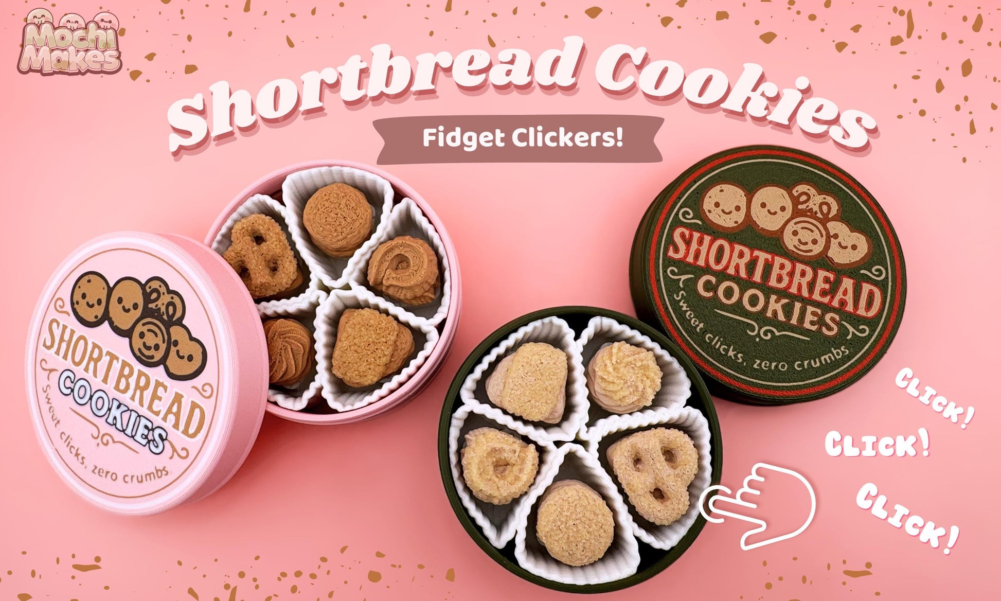 El Fidget Clicker en forma de lata de galletas de mantequilla está inspirado en las nostálgicas latas de galletas de mantequilla, reinventado como un juguete táctil de escritorio. Dentro de la lata hay cinco clickers con forma de galleta, cada uno diseñado para presionarse con un clic nítido y placentero.